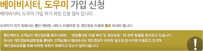 ÅëÀÎÄÉ¾î º£À̺ñ½ÃÅÍ ¹× µµ¿ì¹Ì ¾à°ü ÅëÀÎÄɾî(ÀÌÇÏ ¡®È¸»ç¡¯¶ó ĪÇÔ)´Â ȸ»ç°¡ Á¦°øÇÏ´Â ±¸ÀÎ, ±¸Á÷ Á¤º¸¸¦ ÀÌ¿ëÇÏ¿© Ãë¾÷ Ȱµ¿À» ÇϰíÀÚ ÇÏ´Â ±¸Á÷ÀÚ(ÀÌÇÏ ¡®µµ¿ì¹Ì¡¯¶ó ĪÇÔ)¿ÍÀÇ ½Å·Ú¸¦ ¹ÙÅÁÀ¸·Î ÃÖ»óÀÇ Ãë¾÷¾Ë¼± ¼ºñ½º¸¦ Á¦°øÇϱâ ÀÌÇÏ¿© ´ÙÀ½°ú °°ÀÌ ¾à°üÀ» ÅëÇÏ¿© °è¾àÀ» ü°áÇÑ´Ù. µµ¿ì¹Ì´Â ȸ»ç°¡ Á¤ÇÑ ÀýÂ÷¿¡ µû¶ó º» ¾à°ü¿¡ µ¿ÀÇÇÑ ÈÄ ±¸ºñ¼·ù¸¦ Á¦ÃâÇϰí ȸ»çÀÇ ½ÂÀÎÀ» µæÇÑ ÈÄ¿¡ ¼ºñ½º¸¦ ÀÌ¿ëÇÒ ¼ö ÀÖ½À´Ï´Ù. Á¦1Á¶ (¸ñÀû) º» ¾à°üÀº ȸ»ç¿Í µµ¿ì¹Ì°£ÀÇ ±Ç¸®¿Í Àǹ« ¹× Ã¥ÀÓ¿¡ °üÇÑ »çÇ×À» ±ÔÁ¤ÇÔÀ» ¸ñÀûÀ¸·Î ÇÑ´Ù. Á¦2Á¶ (¾à°üÀÇ È¿·Â ¹× º¯°æ) 1. º» ¾à°üÀº ȸ»çÀÇ ÀÎÅÍ³Ý È¨ÆäÀÌÁö(www.baby-care.co.kr)¿¡ °ø½ÃÇϰųª µµ¿ì¹Ì¿¡°Ô °³º° ÅëÁö ÇÔÀ¸·Î½á ±× È¿·ÂÀÌ ¹ß»ýÇÕ´Ï´Ù. 2. º» ¾à°üÀº ¿Â¶óÀÎ °¡ÀÔÀÎ °æ¿ì´Â ȸ¿ø°¡ÀÔ Àü µ¿ÀÇÇÔÀ¸·Î½á, ¿ÀÇÁ¶óÀÎ °¡ÀÔÀº °æ¿ì ±³À°¼ö·á ÈÄ È¸¿øÁõ°ú ¾à°üÀ» ¿ìÆíÀ¸·Î ¹ß¼ÛÇÏ¿© 15ÀÏ ³»¿¡ µ¿ÀÇÇÔÀ¸·Î½á È¿·ÂÀÌ ¹ß»ýµË´Ï´Ù. (ȸ¿ø°¡ÀÔ ÈÄ 15ÀÏÀÌ Áö³ªµµ µµ¿ì¹ÌÁõ°ú ¾à°üÀ» ¹ÞÁö ¸øÇß´Ù¸é ¹Ýµå½Ã ȸ»ç·Î ÀüÈÇÏ¼Å¾ß ÇÕ´Ï´Ù. 15ÀÏÀÌ Áö³ªµµ ¾Æ¹«·± Å뺸³ª ÀÌÀǰ¡ ¾øÀ» °æ¿ì ¾à°ü¿¡ µ¿ÀÇÇÑ °ÍÀ¸·Î °£ÁÖÇÕ´Ï´Ù.) 3. º» ¾à°üÀº ¼öÁ¤ ¶Ç´Â º¯°æµÉ ¼ö ÀÖÀ¸¸ç, ȸ»çÀÇ ÀÎÅÍ³Ý È¨ÆäÀÌÁö(www.baby-care.co.kr)¿¡ ±× Àû¿ëÀÏÀÚ 7ÀÏ ÀÌÀü¿¡ °øÁöÇÕ´Ï´Ù. 4. º» ¾à°üÀ» °³Á¤ÇÒ °æ¿ì °³Á¤ÀÏ ÀÌÈÄ¿¡ °³Á¤¾à°ü¿¡ µ¿ÀÇÇÑ µµ¿ì¹Ì¿¡°Ô Àû¿ëµÇ¸ç °³Á¤ÀÏ ÀÌÀü ¾à°ü¿¡ µ¿ÀÇÇÑ µµ¿ì¹Ì¶óµµ °³Á¤¾à°ü¿¡ µ¿ÀÇÇÒ °æ¿ì °³Á¤µÈ ¾à°üÀ» Àû¿ëÇÕ´Ï´Ù. °³Á¤µÈ ¾à°üÀÇ °³Á¤ÀÏ ÀÌÈÄ 30ÀÏ À̳»¿¡ ÀÌÀÇÁ¦±â°¡ ¾øÀ¸¸é °³Á¤µÈ ¾à°ü¿¡ µ¿ÀÇÇÑ °ÍÀ¸·Î °£ÁÖÇÕ´Ï´Ù. Á¦3Á¶ (ȸ¿ø°¡ÀÔ ¹× ½ÂÀÎ) 1. º» ¾à°ü¿¡ µ¿ÀÇÇϰí ȸ¿ø¿¡ °¡ÀÔÇϰíÀÚ ÇÏ´Â µµ¿ì¹Ì´Â Ãë¾÷°ü·Ã ºÎ¹®ÀÇ ±³À°À» À̼öÇÏ¿©¾ß ÇÏ¸ç ´ÙÀ½ÀÇ ¼·ù¸¦ Á¦ÃâÇÏ¿©¾ß ÇÕ´Ï´Ù. (ȸ»ç¿¡ Á¦ÃâÇÑ ¼·ù´Â ÀÏü ¹ÝȯÇÏÁö ¾Ê½À´Ï´Ù.) 1) ±¸Á÷½Åû¼ 2) Áֹεî·Ïµîº» 1ºÎ 3) ½ÅºÐÁõ »çº» 1ºÎ 4) »çÁø 2¸Å 5) °Ç°Áø´Ü¼(º¸°Ç¼Ò ¹× ±¹°ø¸³ º´¿ø ¹ßÇà, ´Ü BÇü °¨¿° °Ë»çÇÊ):1³âȸ 2ȸ Á¦Ãâ 2. ȸ»ç°¡ Á¤ÇÑ ±âÇÑ ³»¿¡ ¼·ù¸¦ Á¦ÃâÇÏÁö ¸øÇϰųª Á¦ÃâÇÑ ¼·ùÀÇ ³»¿ëÀÌ º¯°æµÇ¾úÀ» °æ¿ì ´Ù½Ã Á¦ÃâÇØ¾ß ÇÏ¸ç ±×·¸Áö ¸øÇßÀ» °æ¿ì Ãë¾÷Ȱµ¿ ÁßÀÎ °æ¿ì¶óµµ ÀÌ¿ëÀÚ¿¡°Ô ¼·ù¹Ìºñ ¹× °á°Ý»çÀ¯¸¦ Å뺸ÇÏ¿© µµ¿ì¹Ì¸¦ ±³Ã¼ÇÒ ¼ö ÀÖ½À´Ï´Ù. 3. µµ¿ì¹Ì´Â º» ¾à°ü¿¡ µ¿ÀÇÇϰí ȸ»ç¿¡¼ ½Ç½ÃÇÏ´Â ±³À°À» À̼öÇÑ ÈÄ ±¸ºñ¼·ù¸¦ Á¦ÃâÇÏ¿© ¾Æ¹«·± ÀÌ»óÀÌ ¾ø´Â °æ¿ì ¾à°ü¿¡ ¼¸íÇÑ ³¯·ÎºÎÅÍ 1³â°£ °¡ÀÔÀ» ½ÂÀÎÇϰí ȸ»çÀÇ µµ¿ì¹Ì·Î Ȱµ¿ÇÒ ¼ö ÀÖ´Ù. (´Ü, ´ÙÀ½°ú °°Àº °á°Ý»çÀ¯°¡ ¹ß»ýÇÒ ¶§¿¡´Â µµ¿ì¹Ì ½ÂÀÎÀ» ÇÏÁö ¾ÊÀ» ¼ö ÀÖ´Ù.) 1) ½Å¿øÀÌ ºÒÈ®½ÇÇÑ ÀÚ 2) ȸ»çÀÇ ¿ä±¸¿¡ ºÒÀÀÇÏ´Â ÀÚ 3) BÇü °¨¿° ¹× Àü¿°¼º ¹× Áß´ëÇÑ Áúº´ÀÌ ÀÖ¾î µµ¿ì¹Ì Ȱµ¿¿¡ ÁöÀåÀÌ ÀÖ´Â ÀÚ 4) °³ÀÎ ½Å¿ëÁ¤º¸°¡ ¸Å¿ì ÁÁÁö ¾ÊÀº ÀÚ 5) ±âŸ ȸ»ç¿¡¼ ÀûÇÕÇÏÁö ¾Ê´Ù°í ÀÎÁ¤ÇÏ´Â ÀÚ Á¦4Á¶ (¼ºñ½º ³»¿ë ¹× ¹üÀ§) 1. º» ¾à°ü¿¡ µ¿ÀÇÇÏ°í ±¸ºñ¼·ù¸¦ Á¦ÃâÇÏ¿© ȸ»çÀÇ ½ÂÀÎÀ» ¹ÞÀº µµ¿ì¹Ì´Â ȸ»ç¿¡¼ Á¦°øÇÏ´Â ¼ºñ½ºÀÇ µµ¿ì¹Ì·Î Ȱµ¿ÇÒ ¼ö ÀÖÀ¸¸ç ȸ»çÀÇ °è¿»ç ¹× Áö¿ªÁ¡¿¡¼ Á¦°øÇÏ´Â ¼ºñ½ºÀÇ µµ¿ì¹Ì·Îµµ Ȱµ¿ÇÒ ¼ö ÀÖ½À´Ï´Ù. 2. µµ¿ì¹Ì´Â º»Àο¡°Ô ¸Â´Â Á÷±º(º£À̺ñ½ÃÅÍ, °¡»çµµ¿ì¹Ì, »ê¸ðµµ¿ì¹Ì µî)À» ¼±ÅÃÇÏ¿© °¢ ºÐ¾ßÀÇ ±³À°À» À̼öÇØ¾ß Çϸç ȸ»ç´Â µµ¿ì¹Ì¿¡°Ô ¸Â´Â ºÐ¾ß¿¡¼ Ȱµ¿Çϵµ·Ï ¹è·ÁÇÑ´Ù. 3. µµ¿ì¹Ì ÀÓ±ÝÀº ÀÌ¿ëÀÚ°¡ ȸ»ç¿¡ ÀÔ±ÝÇÑ ±Ý¾×¿¡¼ ¼Ò°³ ¼ö¼ö·á¸¦ Á¦¿ÜÇÑ ±Ý¾×À» Á¤»êÇÑ ÈÄ µµ¿ì¹Ì¿¡°Ô Áö±ÞÇÑ´Ù. 4. ȸ»ç°¡ Áö¿ªÁ¡ ¶Ç´Â °¡¸ÍÁ¡À» ÅëÇØ ½Ç½ÃÇÑ ¼ºñ½º´Â Áö¿ª¿¡ µû¶ó ÀÓ±Ý Ã¼°è³ª ³»¿ë¿¡ Â÷À̰¡ ÀÖÀ» ¼ö ÀÖ½À´Ï´Ù. Á¦5Á¶ (µµ¿ì¹Ì À§ÀÓ»çÇ×) 1. ȸ»ç°¡ ÀÌ¿ëÀÚ¿ÍÀÇ Ãë¾÷¾Ë¼± ¼ºñ½º¸¦ ¼öÇàÇϰí ó¸® Çϴµ¥ ÇÊ¿äÇÑ ´ÙÀ½ »çÇ׵鿡 °üÇÏ¿© µµ¿ì¹Ì´Â Àü±ÇÀ» ȸ»ç¿¡ À§ÀÓÇÏ´Â °Í¿¡ µ¿ÀÇÇÑ´Ù. 1) ÀÏÁ¤°ü¸® : µµ¿ì¹Ì¿Í ÀÌ¿ëÀÚ°£ ³¯Â¥¿Í ½Ã°£ Á¶Á¤ ¹× º¯°æ»çÇ× °ü¸® 2) Á¤»ê°ü¸® : ¿¹¾àµÈ ±Ù¹«Á¶°Ç°ú ½ÇÁ¦ ±Ù¹«ÇÑ Á¶°ÇÀÇ Â÷ÀÌ¿¡ µû¶ó º¯µ¿µÈ µµ¿ì¹Ì º¸¼ö Â÷¾× ¹ß»ý½Ã Ãʰú±Ý¾×°ú ¹Ì´Þ ±Ý¾× Á¤»ê ¼ºñ½º 3) ¼ö±Ý°ü¸® : µµ¿ì¹Ì°¡ ÀÌ¿ëÀڷκÎÅÍ ¹ÞÀ» º¸¼ö¿¡ ´ëÇÑ ¼ö±Ý°ü¸® ¼ºñ½º 4) °è¾à°ü¸® : À